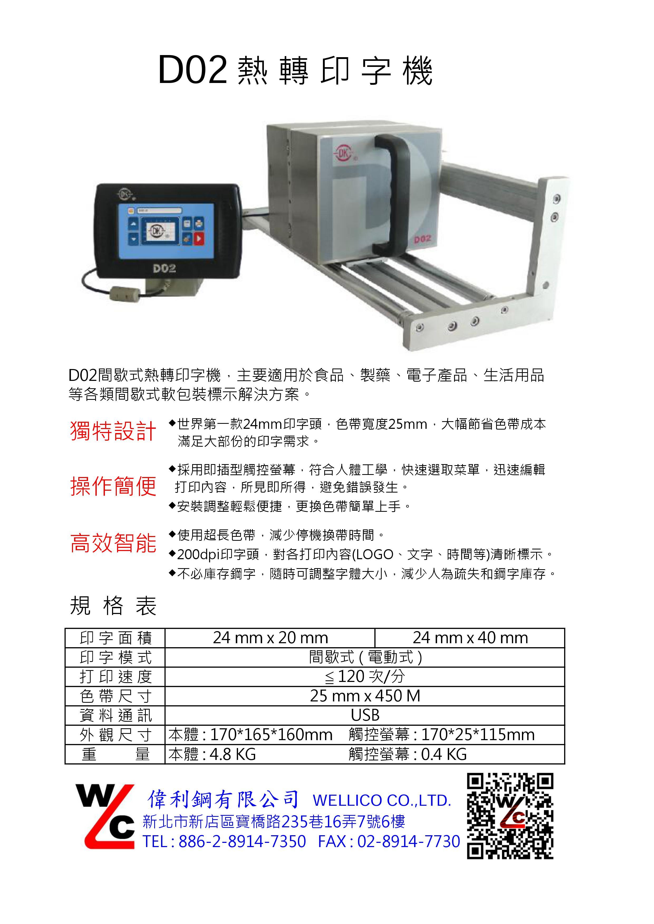 偉利鋼公司自2022/06/20移至新址~,請各位賢達~繼續會予支持 ☆ ★~歡迎光臨本站~☆ ★ 我們準備了最詳細的型錄、最專業的服務 提供國外最新設備,敬請瀏覽參閱 搜尋 首頁 » 商品資訊 » DK 熱轉印字機 » DK 熱轉印字機 » D02熱轉印字機 DK 熱轉印字機 » DK 熱轉印字機 D02熱轉印字機 我要詢價 點擊圖片可以下載PDF檔
